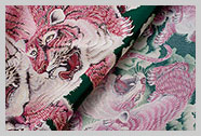 オーバープリントとは、淡い地色より強い色を重ねていく方法。抜染と比べて使える色数が多く、境目の色が重なるためグラデーションがより美しく見える。 和柄のような写実的な柄に向いている。